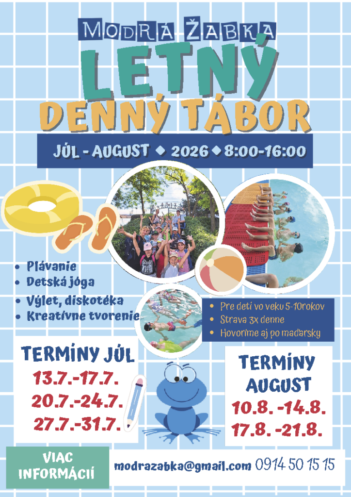 Letný tábor LETO s Modrou ŽabkouDenné plavecké tábory pre deti vo veku 5 – 10 rokov Viac na stránke Tábory